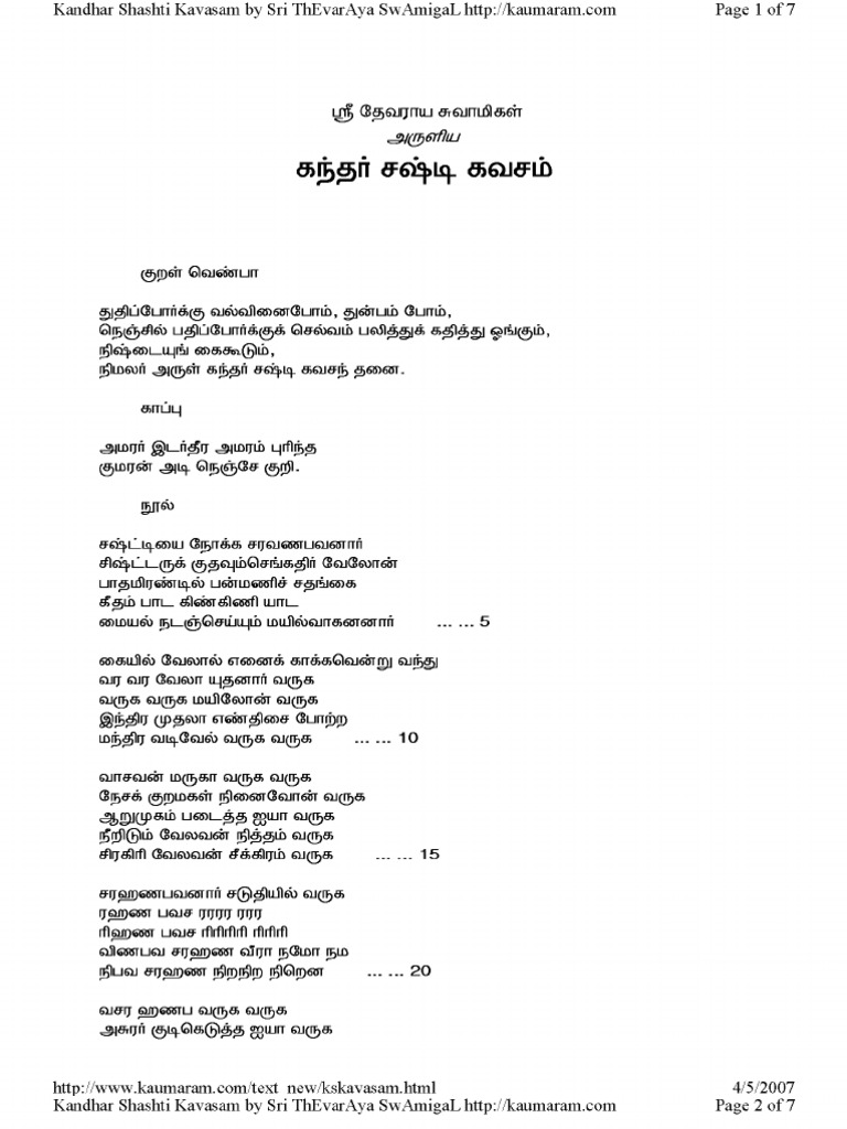 Nenjil pathipporku selvam palithuk kathithongum. Nimalar arul kanthar sashti kavacham thanai. Amarar idar theera amaram purintha. Kanda sashti kavasam lyrics in tamil and english. Kandar sashti kavasam is a song composed by devaraya swamigal on lord muruga.